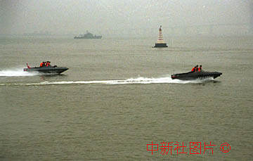 中國武警巡邏快艇十九日在澳門海域的陰雨天氣中穿棱,保衛(wèi)回歸慶典。中新社傳真 彭振戈攝