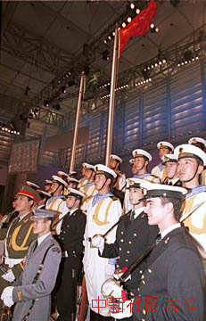參加澳門(mén)政權(quán)交接儀式的中國(guó)人民解放軍與葡萄牙軍隊(duì)的儀仗隊(duì)官兵們,共同在中國(guó)五星紅旗下合影留念。中新社傳真 毛建軍攝
