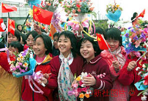 澳門(mén)兒童揮舞五星紅旗和花束,熱烈歡迎江澤民主席和朱镕基總理飛抵澳門(mén)出席政權(quán)交接儀式。中新社傳真 李剛攝