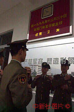 即將進(jìn)駐澳門的解放軍戰(zhàn)士在珠海軍營回歸倒計時牌前整理軍容。中新社數(shù)碼傳真 王瑤攝