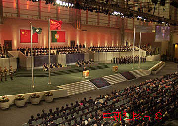 在澳門政權(quán)交接儀式上,中華人民共和國(guó)國(guó)旗和澳門區(qū)旗高高飄揚(yáng)。江澤民主席發(fā)表重要講話。中新社數(shù)碼傳真 毛建軍攝