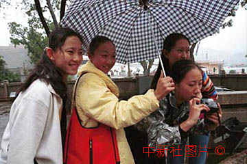 前來澳門參加歡慶回歸文藝演出的北京女藝員,十八日在小雨中到媽姐廟前觀光拍照。 中新社傳真 彭振戈攝