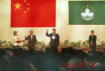 澳門特區(qū)政府在成立首日舉行招待會,首任行政長官何厚鏵向國務院副總理錢其琛舉懷共賀。 中新社傳真 宗金柱攝
