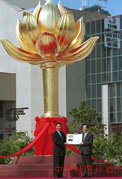 國務(wù)院副總理錢其琛二十日代表中國中央政府向澳門特區(qū)贈送禮品--盛世荷花,并將禮品證書送到首任特首何厚鏵手中。 中新社傳真 宗金柱攝