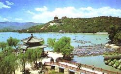 北京明、清時(shí)所修宮廷苑囿,不少是依照江南的風(fēng)景名勝。昆明湖西部的設(shè)計(jì),很顯然是完全依照西湖蘇堤、白堤的風(fēng)景情調(diào),如果劃條小船,劃到龍王廟西北一點(diǎn)水面上,向西望去,則很象在杭州西湖中,望清波門外昭慶寺門前到斷橋的那一段堤痕,玉泉山正像初陽臺,玉泉山的塔如同保俶塔,情趣十分近似。